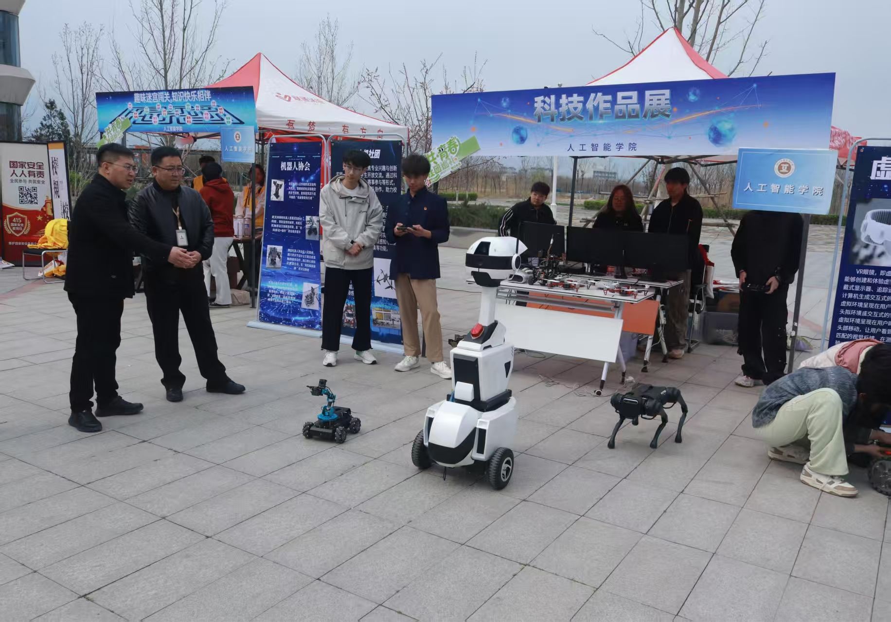 春日市集现场热闹非凡,学院精心布置展区,以科技为名片,集中展示学院社团的专业风采与创新实力。机器狗展区吸引了大批学生驻足——它随节奏灵活起舞、俯身互动,动作流畅生动,引发阵阵惊叹;学生们踊跃参与互动,亲身体验操控过程,领略人工智能技术的神奇与乐趣。VR体验区同样备受欢迎,学生们戴上VR眼镜、手持控制手柄,沉浸于虚拟世界之中,新奇的沉浸式体验令人流连忘返。无人机展示区则以其精巧的结构设计和扎实的技术背景,吸引学生们前来了解探寻。学院展区以鲜明的科技特色成为市集中一道亮丽的风景线,充分彰显了学院学生将专业知识转化为生动实践的能力与热情。