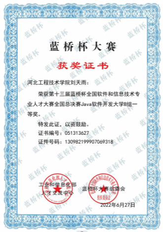 荣誉:2022年Java软件开发B组河北省一等奖,全国总决赛一等奖。2023年Java软件开发A组(985院校通道)河北省一等奖,全国总决赛二等奖。