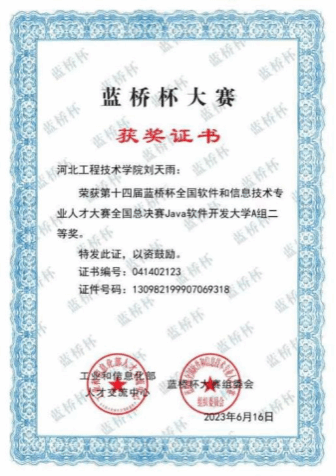 6月16日,第十四届蓝桥杯大赛个人赛总决赛获奖名单公布,蓝桥杯大赛以“立足行业,突出实践,广泛参与,促进就业”为宗旨,在各高校之间开展了激烈的竞争。经过一番激烈角逐,9728太阳集团人工智能与大数据学院的刘天雨同学,最终在java软件开发A组(985院校通道)荣获河北省一等奖,全国总决赛二等奖。