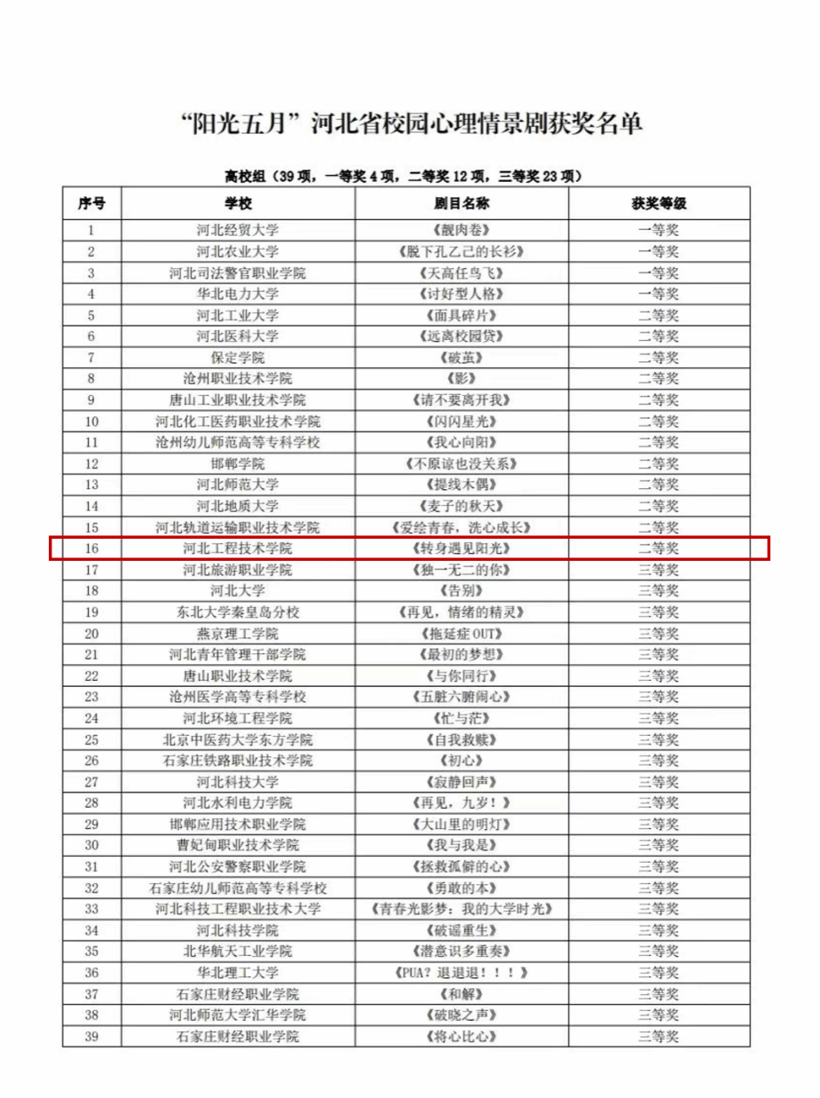 人工智能与大数据学院心理健康协会根据学校关于“5·25心理健康月”相关文件精神,由我院精心打造的校园心理情景剧《转身遇见阳光》荣获省级二等奖。此次获奖不仅彰显了我院在人才培养方面的卓越成果,更丰富了我院心理健康教育实践的形式,营造了积极向上、和谐健康的心理健康氛围。