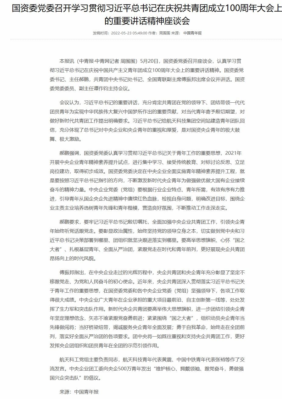 国资委党委召开学习贯彻习近平总书记在庆祝共青团成立100周年大会上的重要讲话精神座谈会