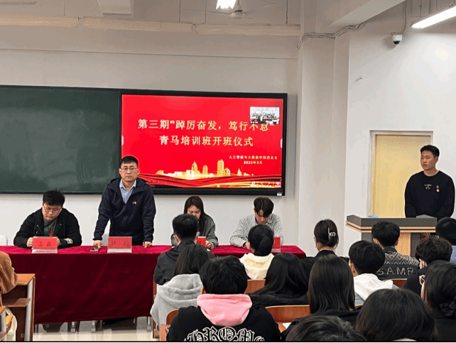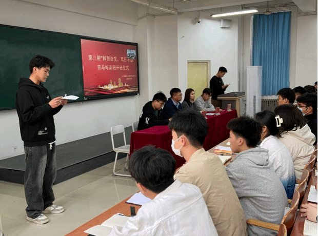 本次青马培训开班仪式由青马培训负责人刘宇轩主持,开班仪式在嘹亮的团歌声中拉开帷幕。首先,由尹钧院长宣布第三期“踔厉奋发,笃行不怠”青马培训班正式开班。接着由青马培训班学员代表于仰昊代表全体学员郑重承诺:“严格遵守青马培训班的规章制度,积极配合各项工作,认真学习,在学习中实践升华自己的人格,为成为一名真正的大学生骨干、成为合格的预备党员而努力奋斗,并为学校的建设和发展做出贡献!”