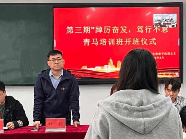 为深入学习习近平新时代中国特色社会主义思想和党的二十大精神,扎实推进青年马克思主义者培养工程,提高青年学生的理论素养和实践水平,培养勇于担当大任的新时代青年。人工智能与大数据学院于2023年3月20日12:15在主教1-1和1-2教室举行第三期“踔厉奋发,笃行不怠”青马培训班开班仪式。参会人员有人工智能与大数据学院党总支书记兼学管副院长尹钧,团总支书记王珊,太阳集团办公室主任孟鑫,团总支学生副书记段鹏飞、青马管理中心主任刘宇轩以及全体青马培训班学员。