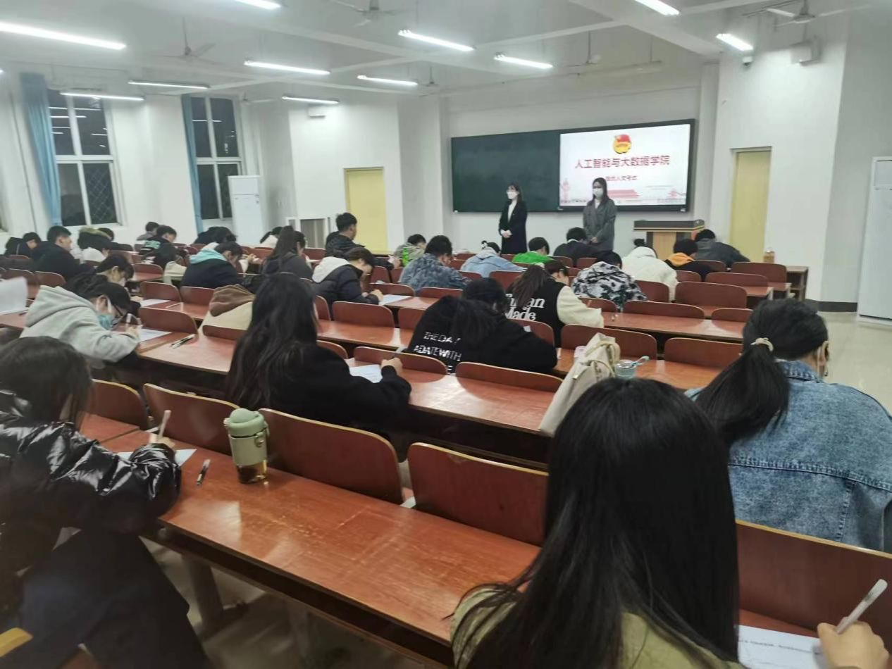 现场候考时,同学们秉承严记校训、以德为先、诚信考试的态度,静候考卷的分发,彰显出我院学子良好的素质以及对党团的敬重之心。本次考试由人工智能与大数据学院团总支书记王珊主持,在考试正式开始之前由监考老师王珊宣读考试规则,并强调考试纪律;在考试开始时,监考老师王凤向考生们展示试卷密封完好,由秦冰松、屠静尧为考生下发试卷。在考试过程中,考生认真作答、态度端正,考场秩序井然,纪律良好;考试结束时,秦冰松、屠静尧负责收取考生答卷,监考老师负责维持考场秩序。在整个考试过程中,未出现任何违规情况。