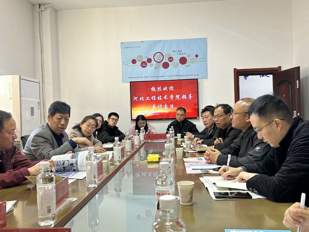 在走访过程中,常书记一行受到了河北军涛科技有限公司总经理马春庭及新华区科技局相关领导的热情接待。首先,企业负责人详细介绍了公司发展历程、业务范围、企业文化以及人才需求情况,常书记认真听取了企业的大致情况,并向企业介绍了学校的办学特色、专业设置、人才培养模式以及近年来取得的教学科研成果。他强调,学校始终坚持以培养应用型人才为目标,注重学生实践能力和创新精神的培养,致力于为社会和企业输送更多优秀的专业人才。同时表示,开展访企拓岗专项行动是学校深化产教融合、校企合作的重要举措,希望通过此次行动,与企业建立更加紧密的合作关系,共同探索人才培养新模式,为毕业生搭建更广阔的就业平台。随后,人工智能与大数据学院院长介绍了学院的专业设置、教学特色以及校企合作办学模式,并表达了希望与企业在课程建设、实习实训、就业指导等方面开展深度合作的愿望。