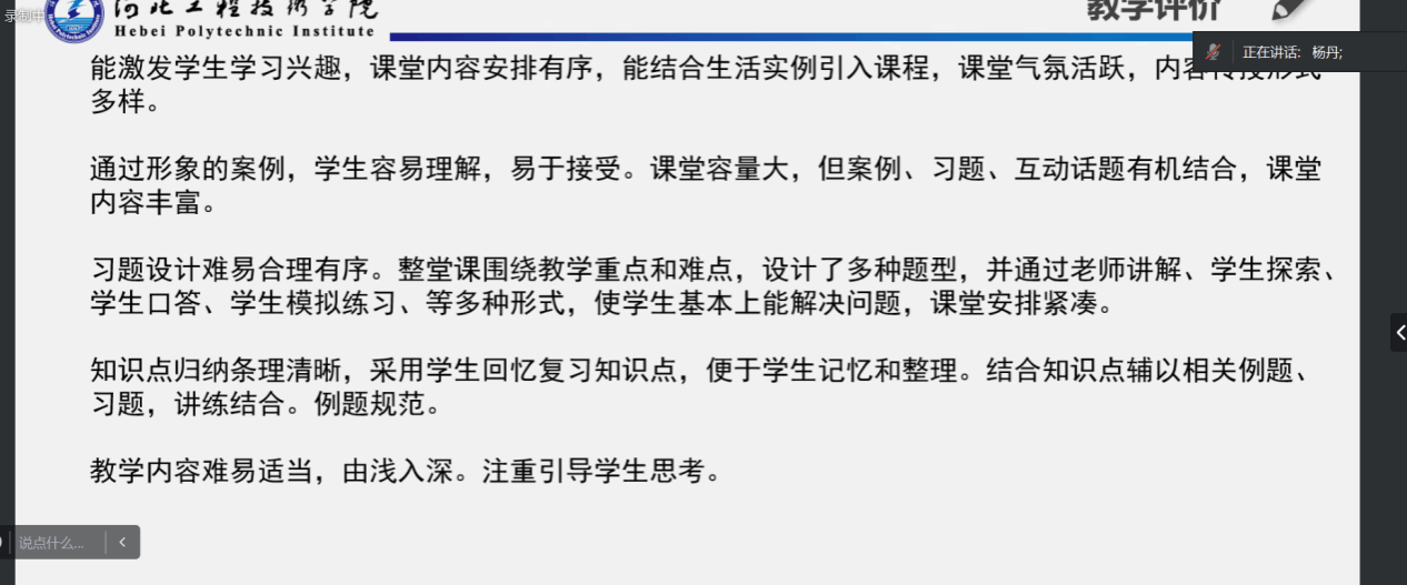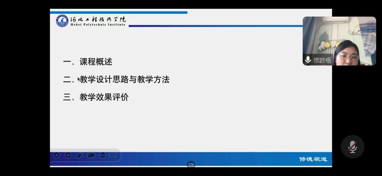 本次比赛采用线上方式进行,邀请我院教学副院长林海霞、孙劼和各系主任担任评委。说课要求重点突出课堂教学创新的理论依据、实施过程以及效果。教学要求教学理念符合新课程改革,课堂教学创新元素表现充分,语言简练,表意准确。