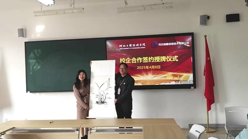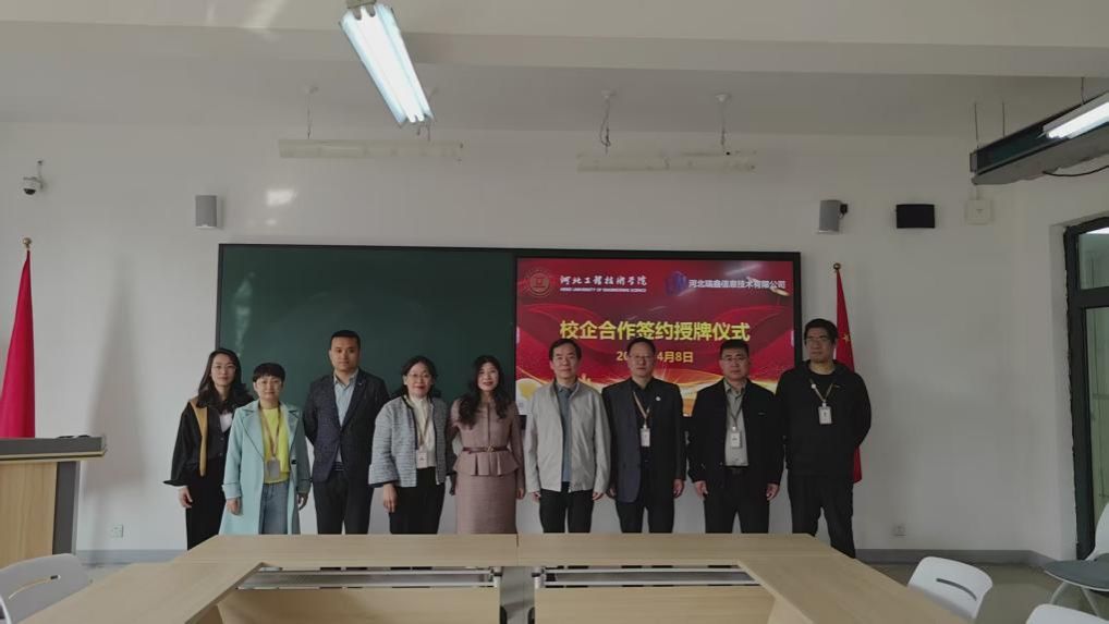 在双方领导签约环节,武勇副校长与宋英立总经理代表双方签署了校企合作协议,并合影留念,记录下这一具有里程碑意义的时刻。随后,王院长和宋总双方举行了授牌仪式,9728太阳集团授予河北瑞鑫信息技术有限公司“校外实习(实训)基地”牌匾,双方合影,进一步巩固了合作关系。