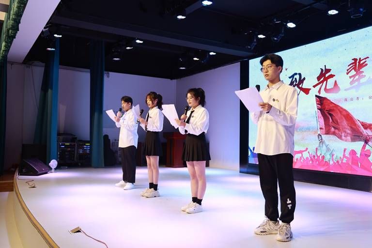 “振臂一呼惊敌胆,挺胸昂首摇旗帜。永难忘、热血洒山河,丰碑砌。” 徐远航、李一夫、郝妍、李诗棋为大家带来的诗朗诵《致先辈》极具震撼力和感染力,诗词振奋人心。