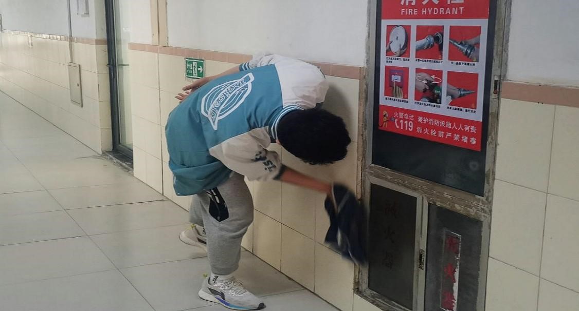 学生擦拭墙面