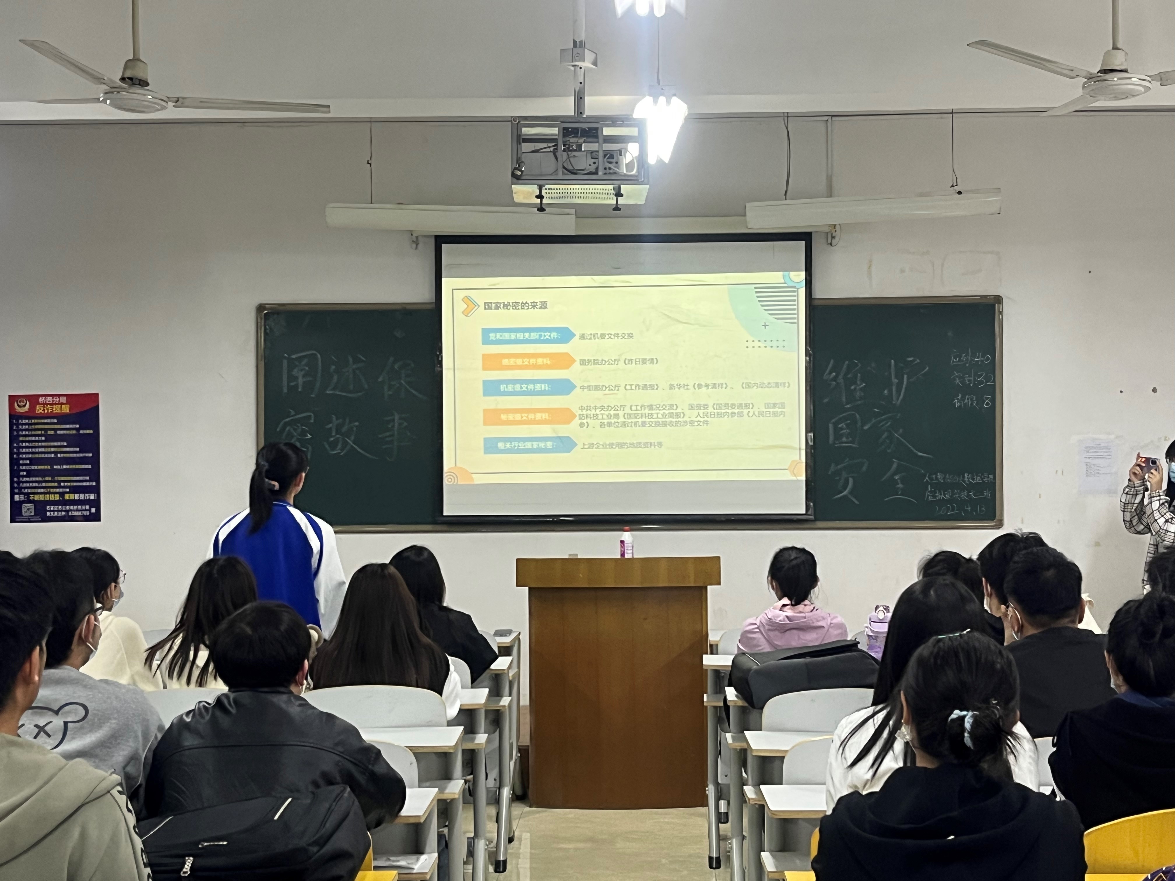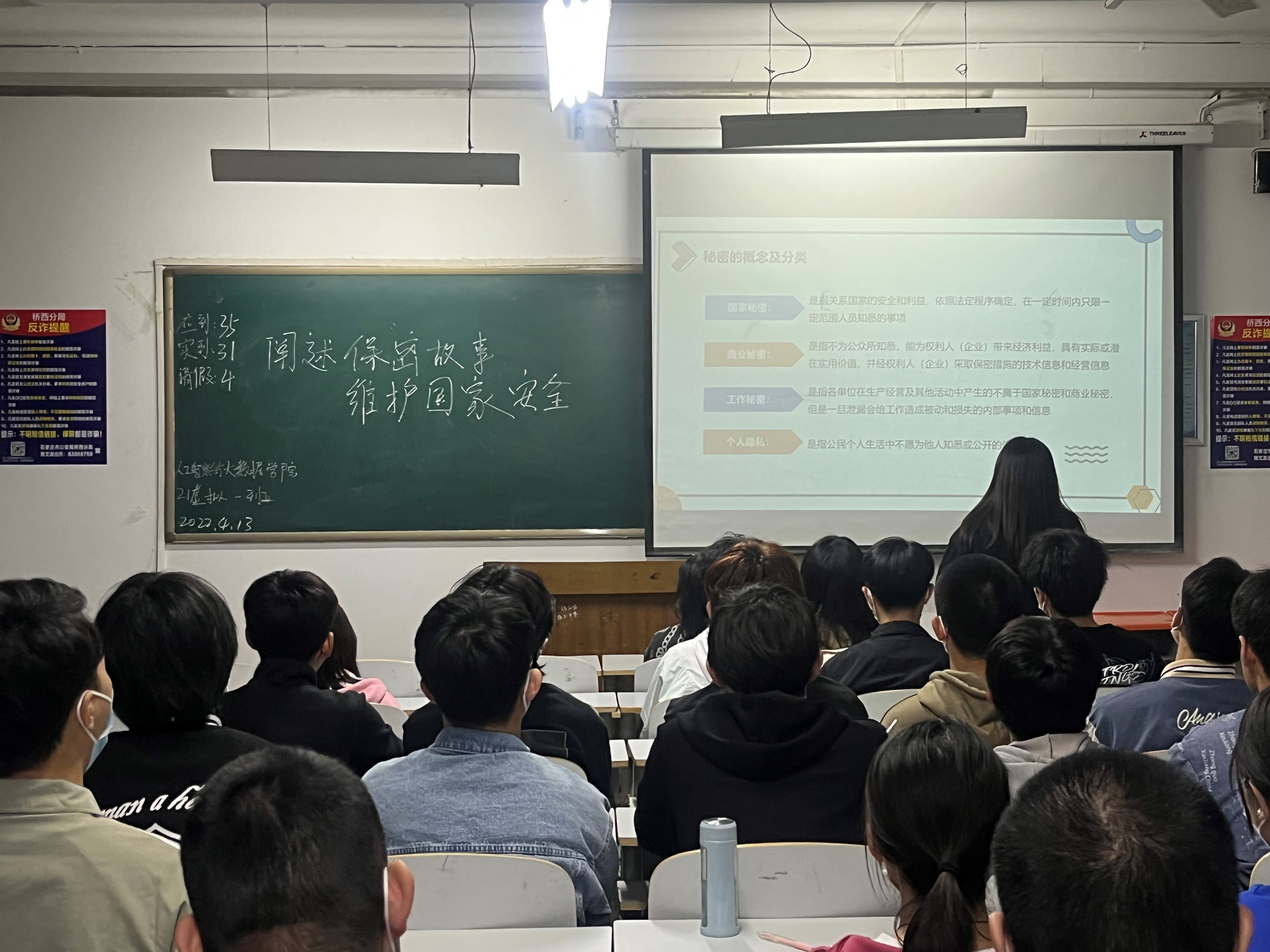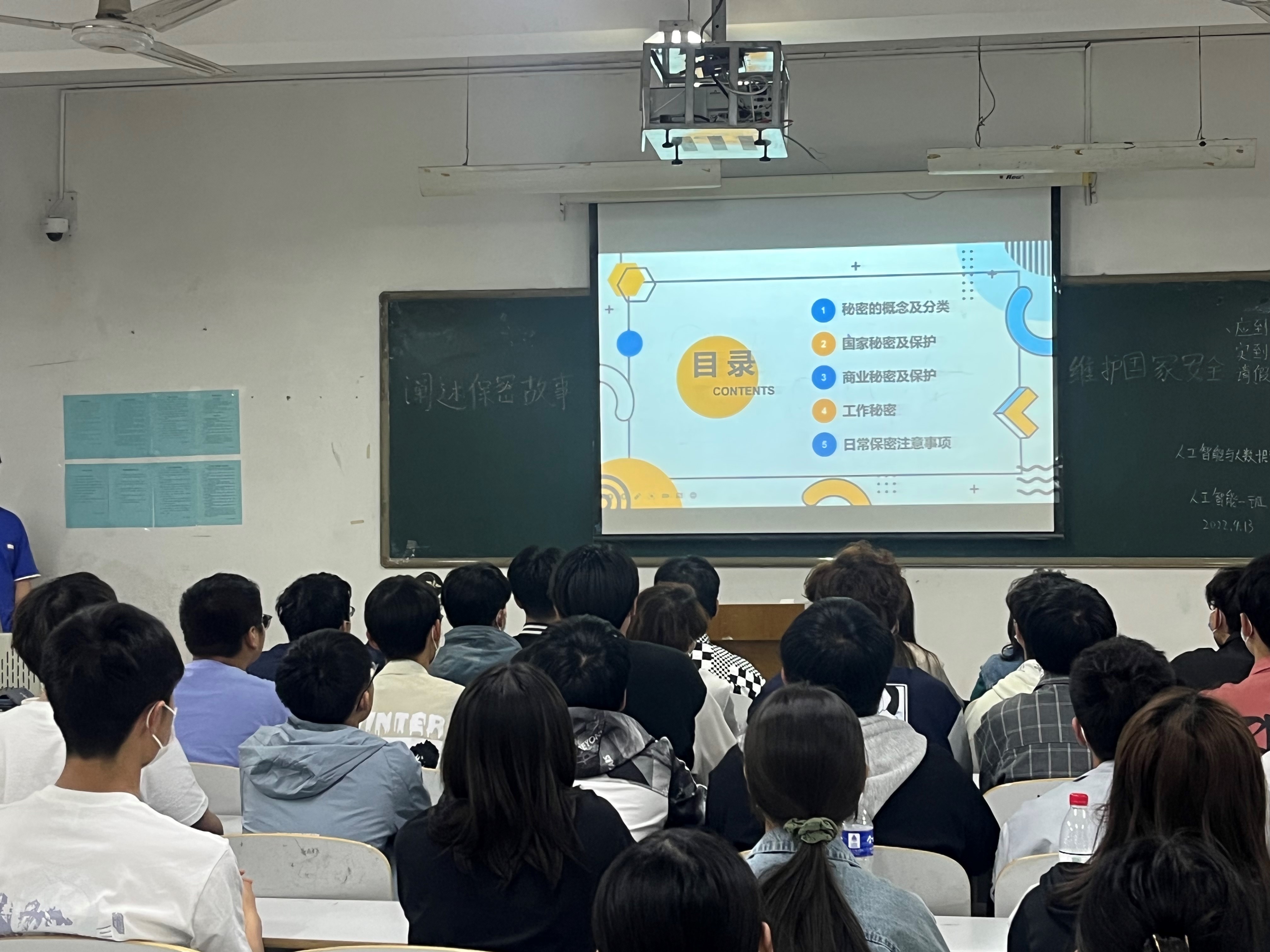为了贯彻落实习近平总书记提出的“总体国家安全观”,让大学生树立自觉关心保护国家安全的意识,构建平安校园,促进学校和谐发展。人工智能与大数据学院于4月13日晚上七点在各班自习室开展关于“阐述保密故事,维护国家安全”主题班会。本次班会由各班班长主持。