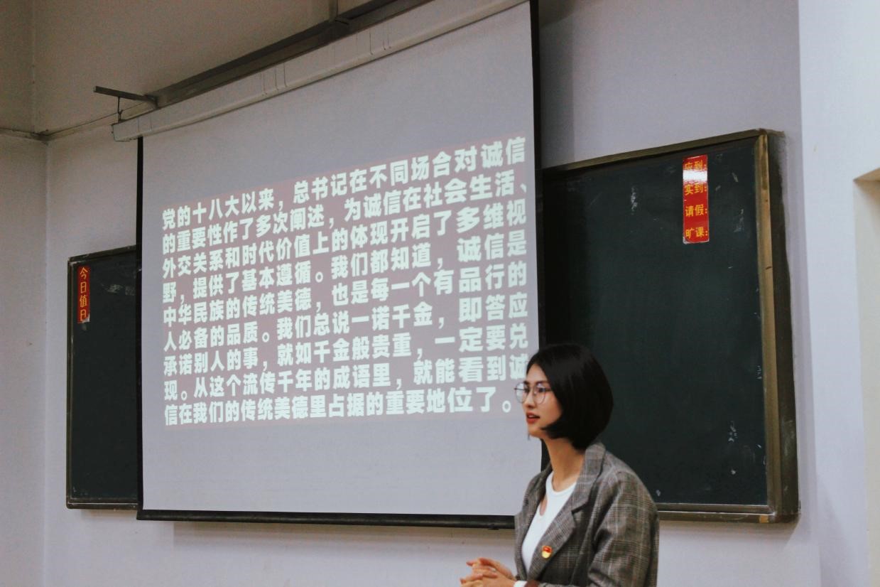 诚实守信是为人之本,为培育和践行以社会主义核心价值观为核心,大力弘扬诚信文化,切实提升学生的诚信品质,增强自律意识和社会责任感,人工智能与大数据学院于2022年3月14日晚7:30在主教1-2教室召开关于“诚信基石,弘扬风采”主题团课,本次主题团课由团总支书记苗璋寒老师主持,各社团负责人以及大一各班班长、团支书参加。