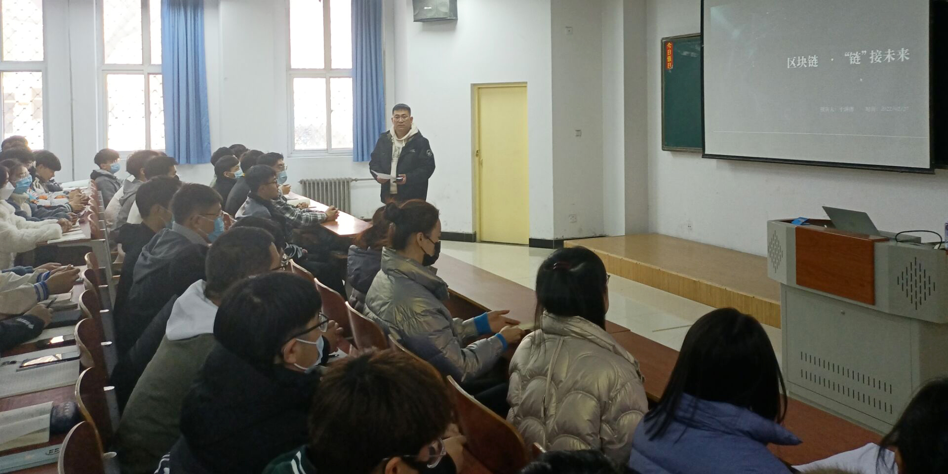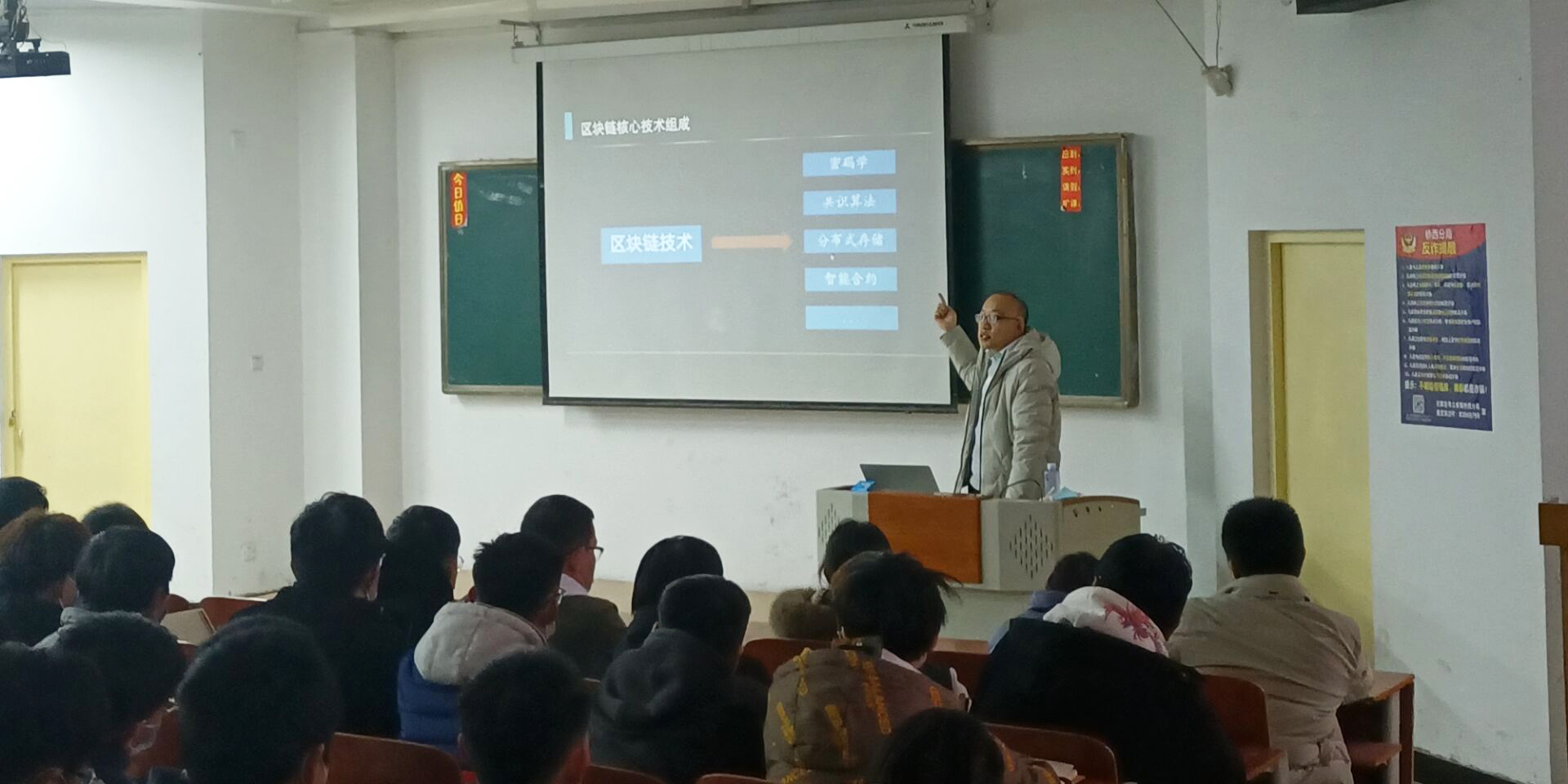 首先,由人工智能大数据学院学管副院长尹钧主持并介绍出席的老师与于洪伟总监。随后,于总监分享个人经历,结合自身的学习和工作经验从三个方面进行区块链相关讲解:1.针对区块链技术的分析。介绍区块链技术是利用块链式数据结构来验证与存储数据,利用分布节点共识算法来生成和更新数据、利用密码学的方式保证数据传输和访问的安全;2.讲解区块链核心技术的组成与发展动态。提出去中心化系统问题,从两方面对问题的形成原因和发展过程进行深入浅出的分析;3.解析区块链技术未来趋势。于总监指出,区块链技术与人工智能、大数据、物联网、边缘计算、云计算、5G等新一代信息技术类似,都是数字化信息系统的基础设施,若能促进各类技术之间的融合发展 ,可以更有效地促进数字经济与数字社会的发展。最后,于总监进行总结,区块链技术未来趋势有多种可能,对现场老师与学生,从理论学习和实践技能角度提出相应的指导与规划。