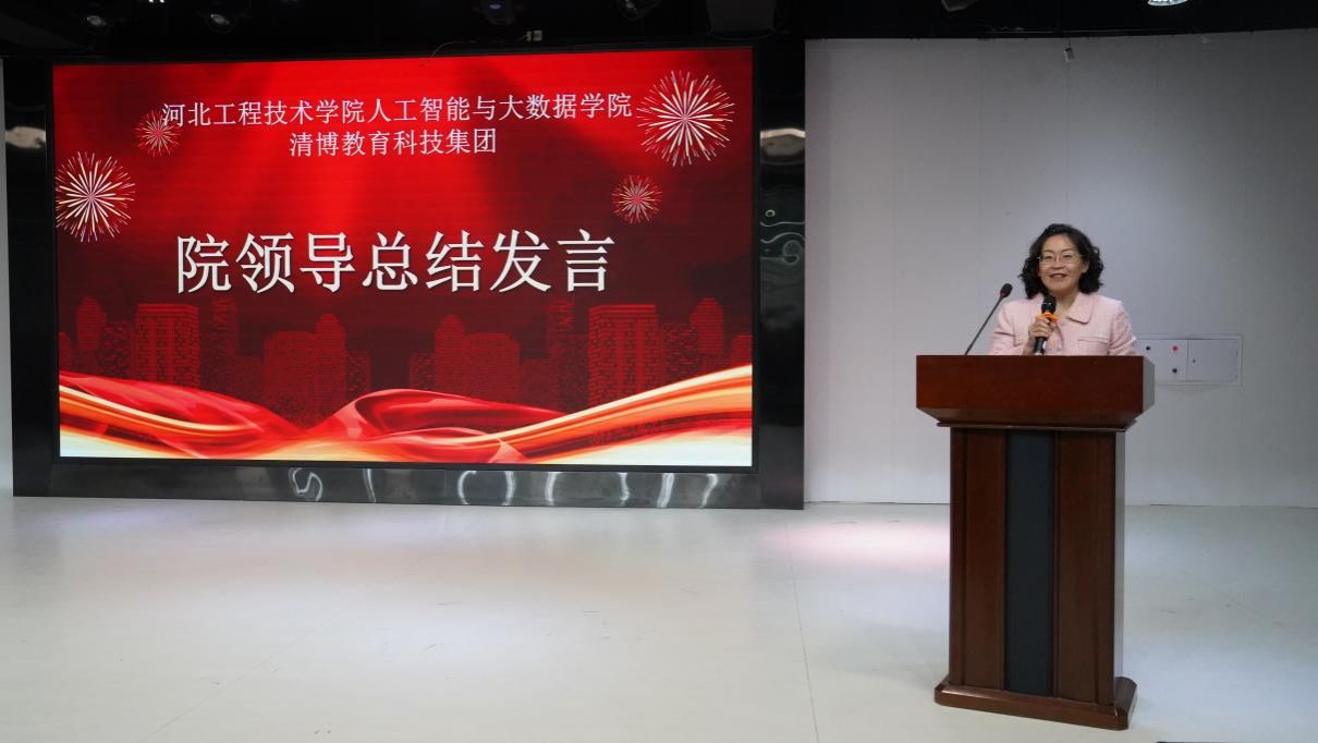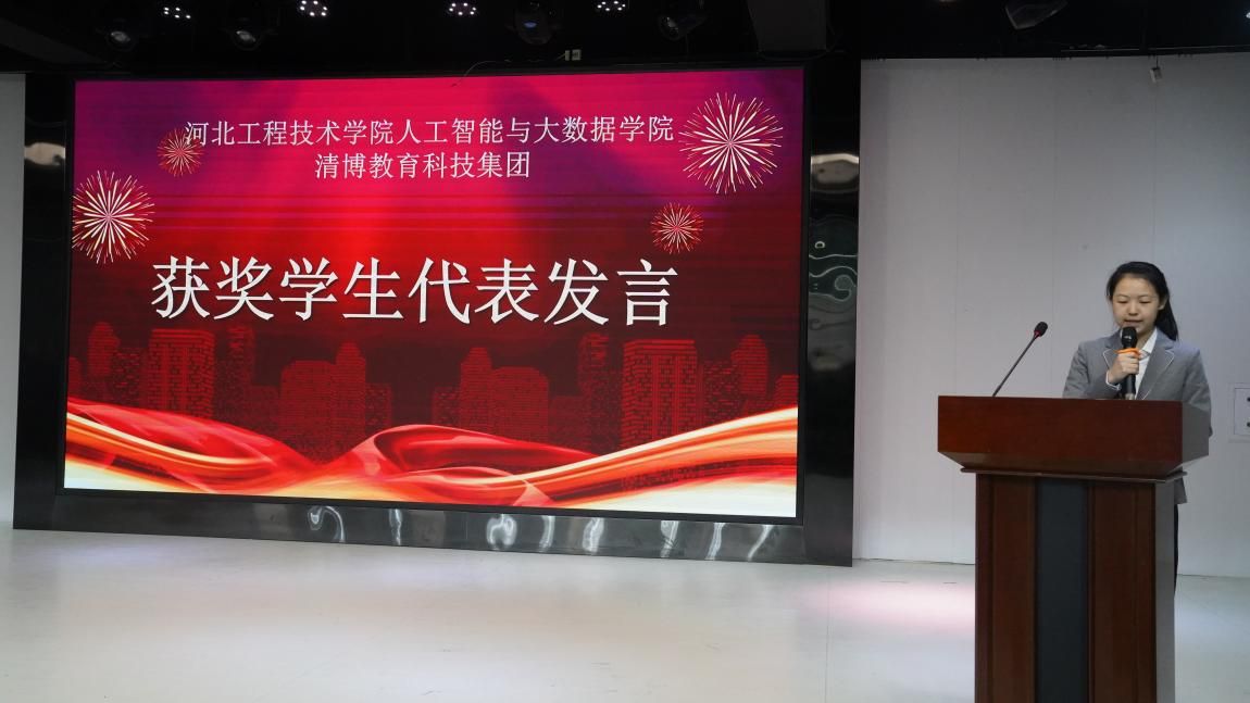 在典礼最后,人工智能与大数据学院王静红院长为本次颁奖典礼做了总结发言,她首先对获奖学生表达热烈的祝贺,并希望学子珍惜荣誉,戒骄戒躁,以此为动力,更加严格要求自己,再攀高峰。鼓励同学们奋发向上,努力拼搏,将来回报学校,回报社会。同时,期望清博日后能够持续关注并鼎力支持教育事业的发展,共同为社会培养更多优秀人才贡献力量。